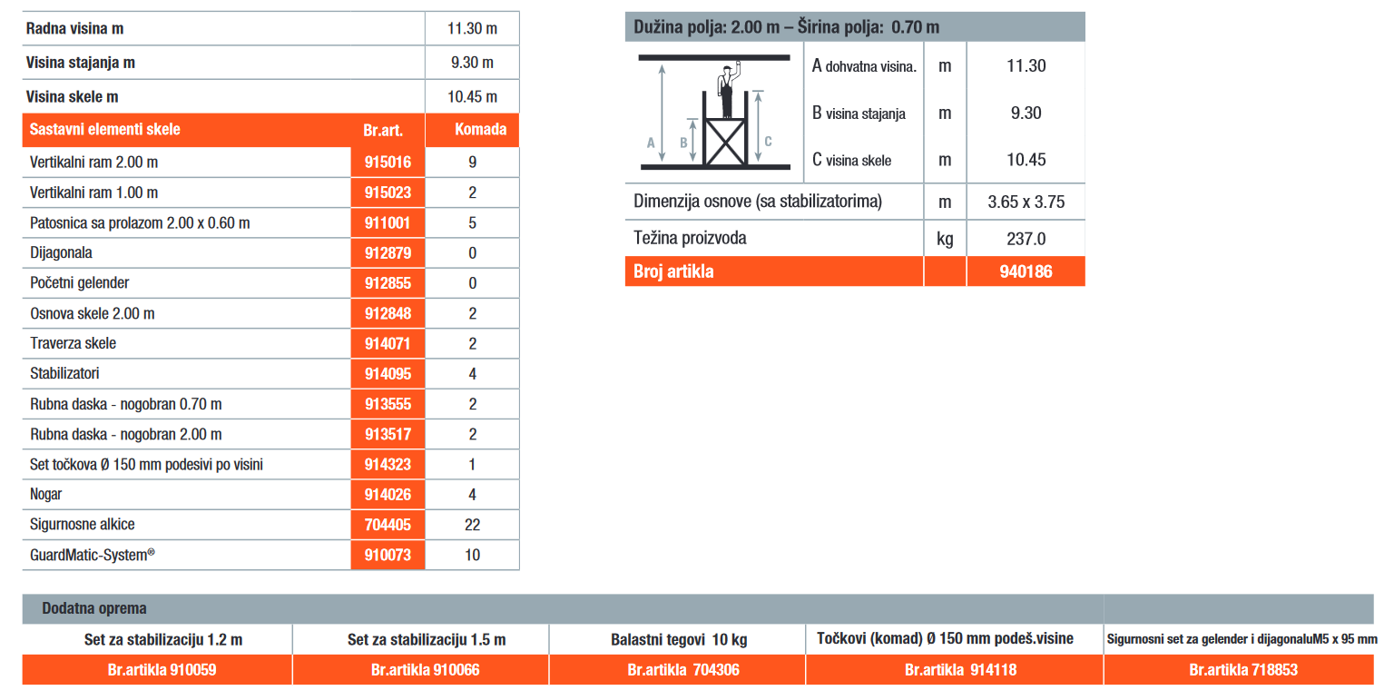 + Ispitane od strane TÜV/GS, zadovoljava norme EN 1004-1, nosivost skele 200 kg/m2
