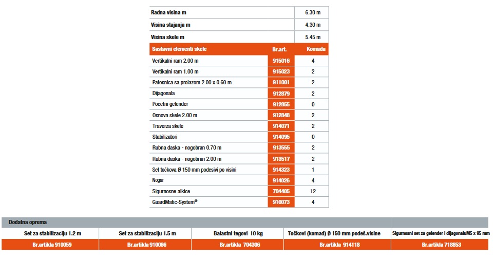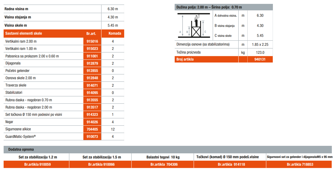 + Ispitane od strane TÜV/GS, zadovoljava norme EN 1004-1, nosivost skele 200 kg/m2