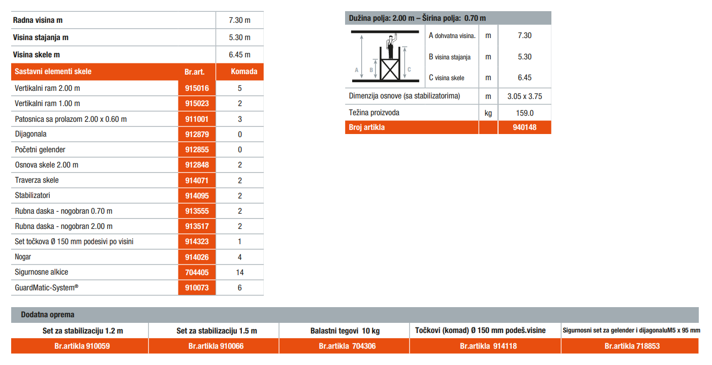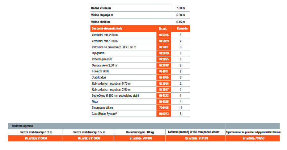 + Ispitane od strane TÜV/GS, zadovoljava norme EN 1004-1, nosivost skele 200 kg/m2