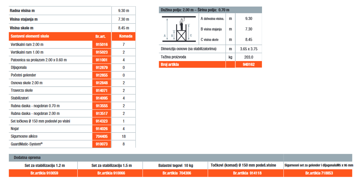 + Ispitane od strane TÜV/GS, zadovoljava norme EN 1004-1, nosivost skele 200 kg/m2