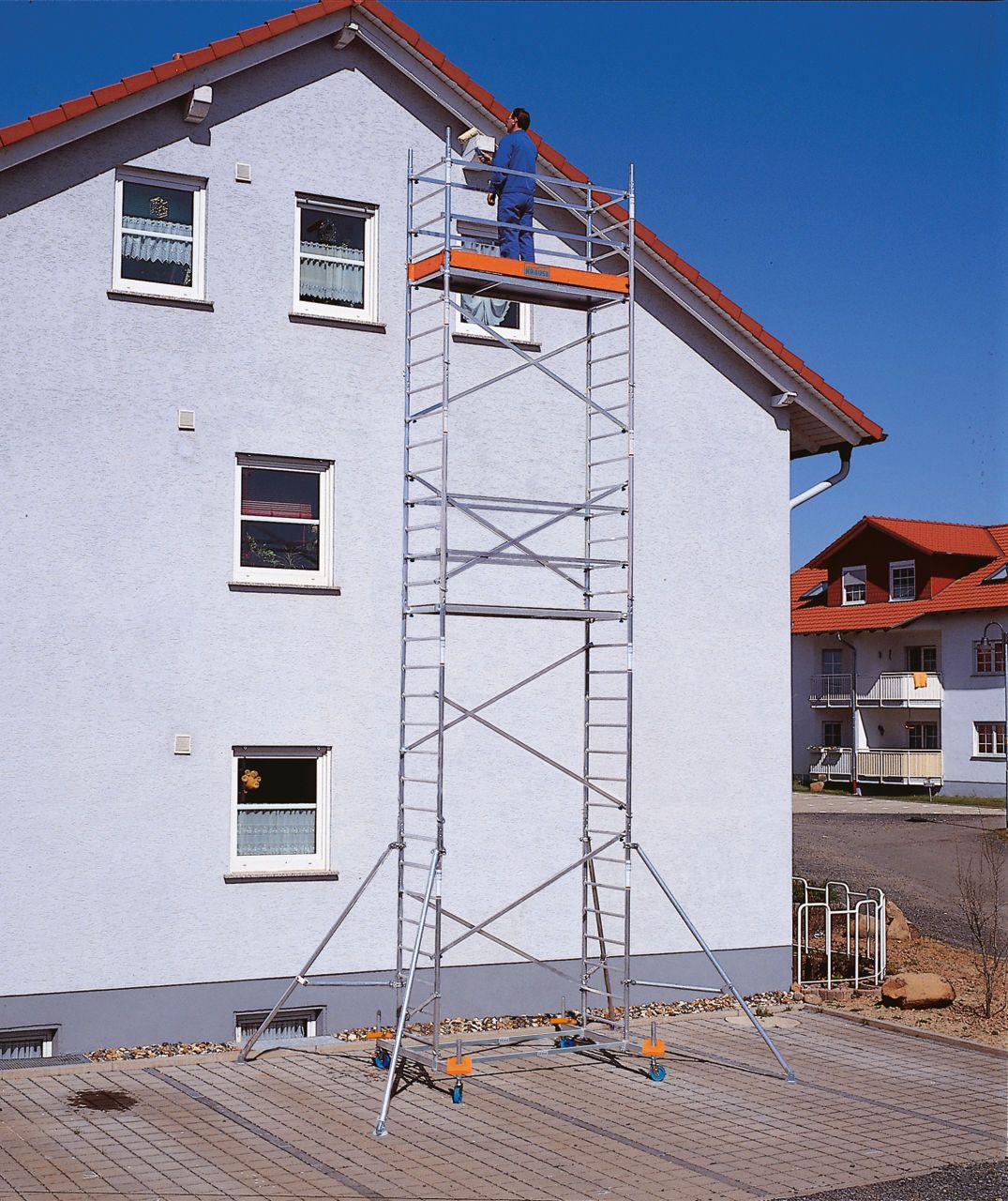 - Koriste se točkovi sa podešavanjem visine i kočnicama – skela je pogodna za rad i na neravnim terenima