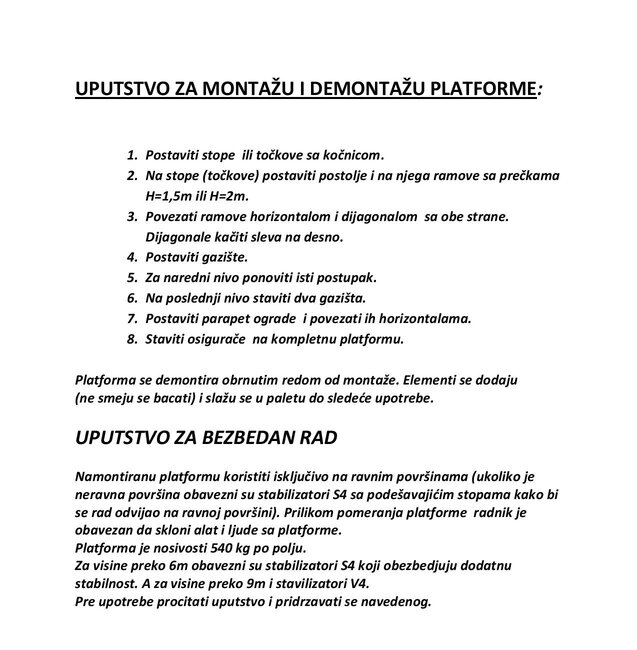 POKRETNA PLATFORMA za rad na visini poseduje stručni nalaz o izvršenom pregledu i ispitivanju opreme za rad u cilju utvrđivanja primene propisanih mera bezbednosti i zdravlja na radu