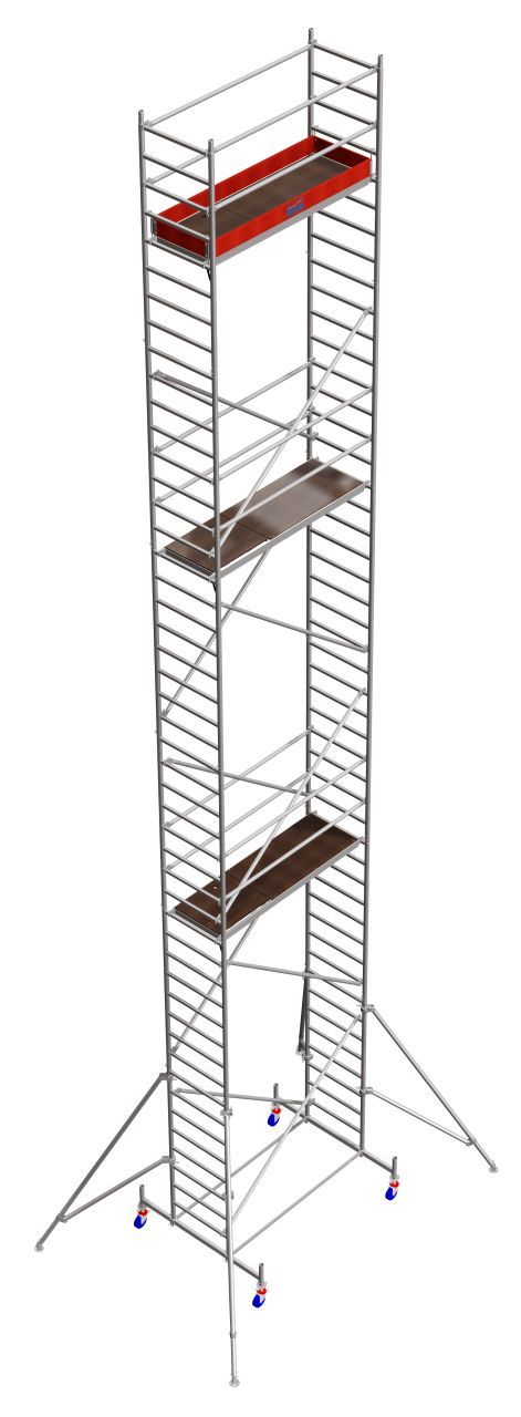 - Koriste se točkovi sa podešavanjem visine i kočnicama – skela je pogodna za rad i na neravnim terenima.
