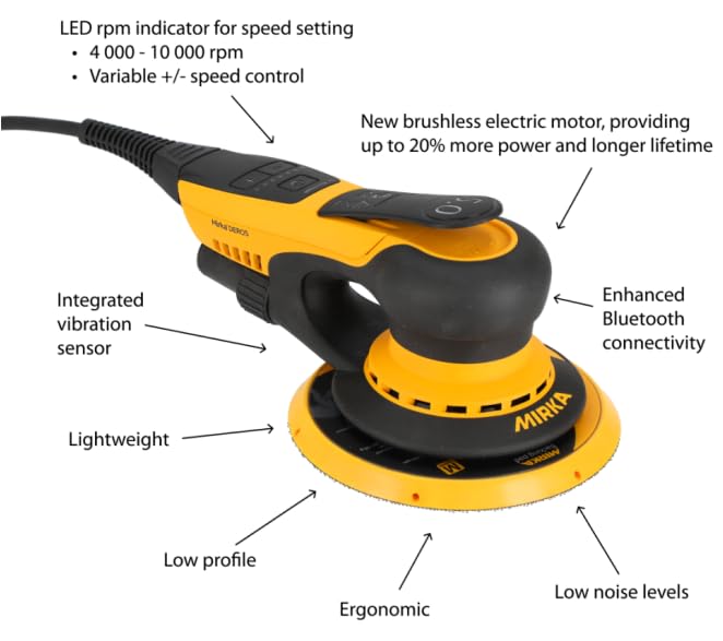 Kao deo Mirka-inog sistema za brušenje bez prašine, DEROS II omogućava efikasno brušenje bez prašine, a Bluetooth konekcija omogućava besprekornu integraciju sa aplikacijom myMirka radi praćenja vibracija.