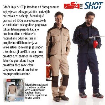 Materijal 100% pamuk. Imaju dva džepa sa strane, dva pozadi i jedan napred, džepove za protektore na kolenima, džep za telefon i metar, i futrolu za karticu. Lastiš na struku i podesive bratele.