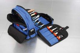 Ranac za alat sa snažnim sintetičkim platnom, podeljenim u dva odeljka, sa velikim brojem džepova i prstenova za alate i instrumente