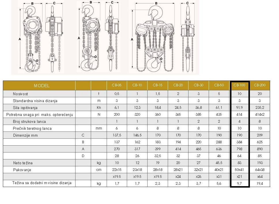 Naziv proizvoda : Ručna lančana dizalica 10 t/3m ( SA ATESTOM ) - CB-100 - H.F.S. Austria