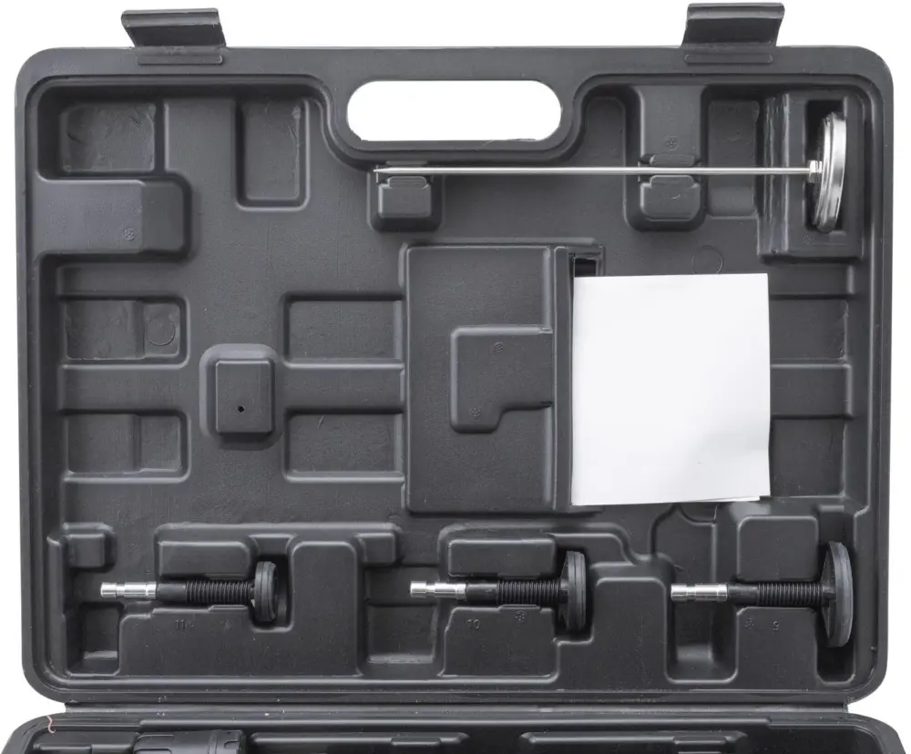Komplet sadrži veliki broj adaptera i proširenja koji omogućavaju rad sa širokim spektrom evropskih i azijskih vozila. Zahvaljujući preciznom manometru (0–35 psi) i odvodnom ventilu, rad je bezbedan, kontrolisan i pouzdan.