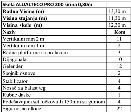 Naziv proizvoda : Aluminijumska pokretna skela (i na stepeništu) ALUALTECO PRO 200, radna v. 13,3m (2,5x0,8m) -atestirana (stopala bez prosirenja)