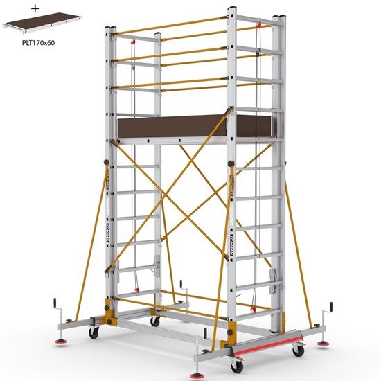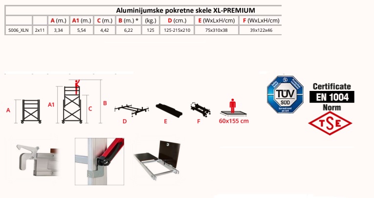 Sve dvodelne pokretne skele imaju dimenziju platforme 60x155cm. Brzo sklapajuće su i imaju dve platforme, osim modela S004XLN.