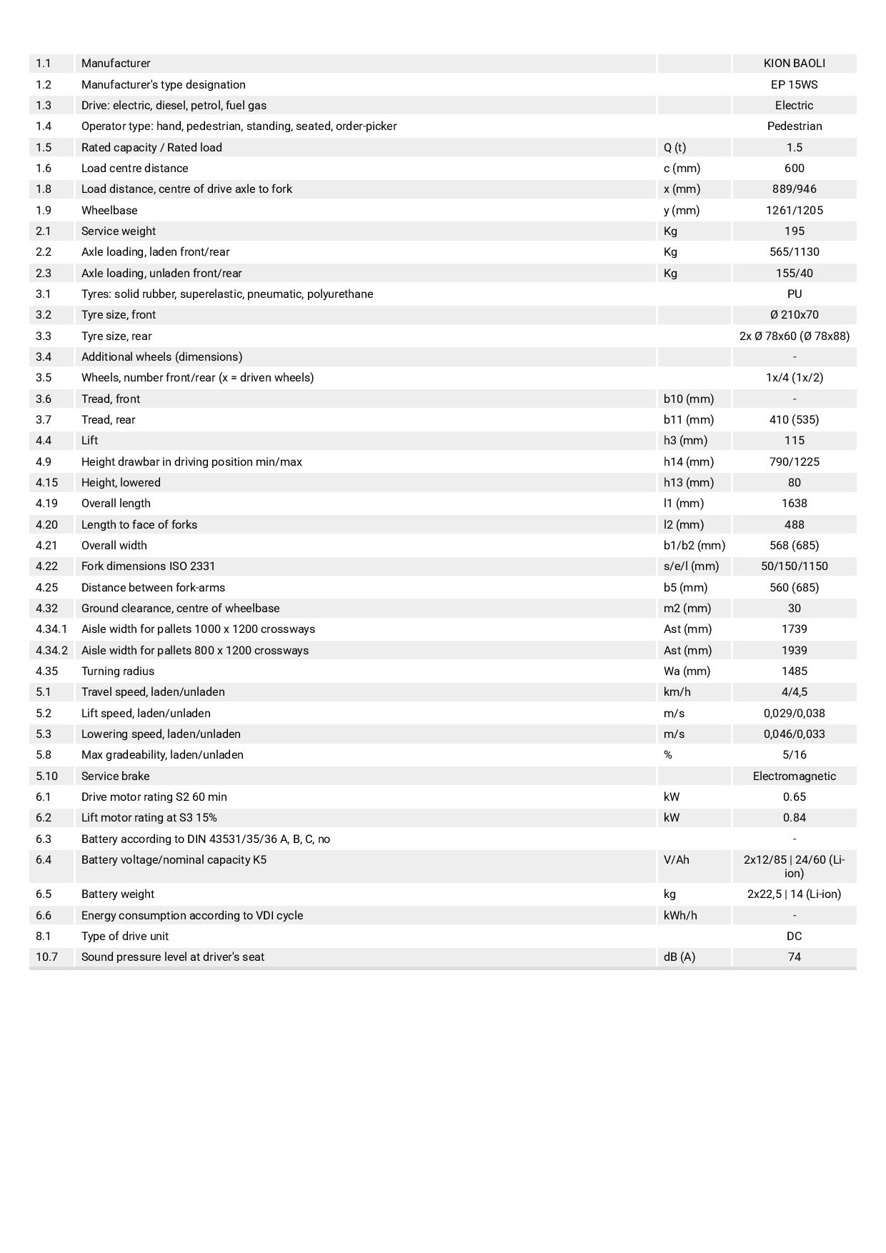 Naziv proizvoda : Baoli elektro paletar EP15WS, 1.5t, visina dizanja 115mm, vile 1150mm
