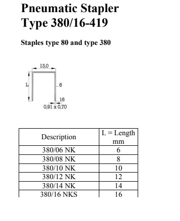 Klešta koriste spajalice tipa 80/380 u dužinama od 6 do 16 mm.