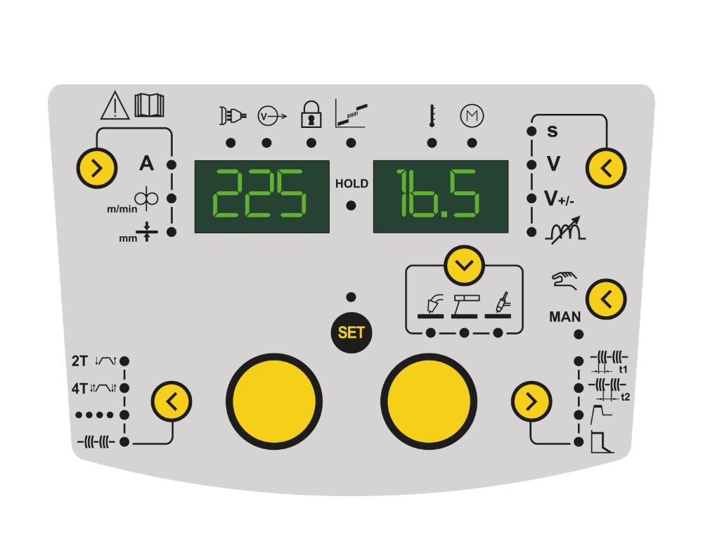 - Synergic, kontroliran snažnim mikroprocesorom, zahvaljujući promjeni brzine žice, automatski postavlja parametre zavarivanja. Operater mora odabrati samo promjer metala i žice.