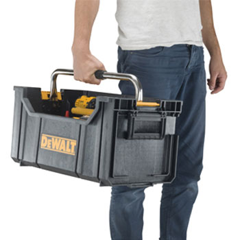 DeWALT Tough-Sistem Tote, kompatibilan sa Tough-Sistemom i ima brave na bočnoj strani za nošenje nekoliko jedinica zajedno.