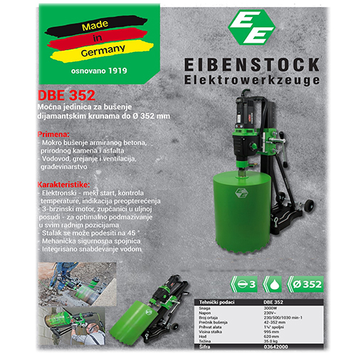 Naziv proizvoda : EIBENSTOCK Dijamantska bušilica za mokro bušenje sa stalkom za beton DBE352 ( 3000W, max.Ø352 )EBM352/3 -busilica +BST352V stalak