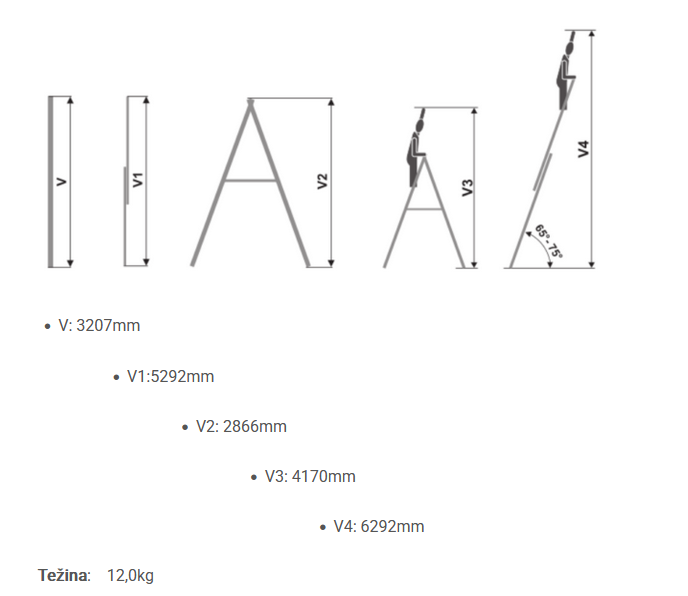 2×12 aluminijumske kombinovane merdevine koji mogu da se otvaraju i “teleskopski” i “A” . Izuzetno kvalitetne, tako da mogu da služe kako za domaćinsko tako i za industrijsko korišćenje. Odlikuje ih visok kvalitet korišćenih materijala i završne obrade. Maksimalni kapacitet 150 kg.