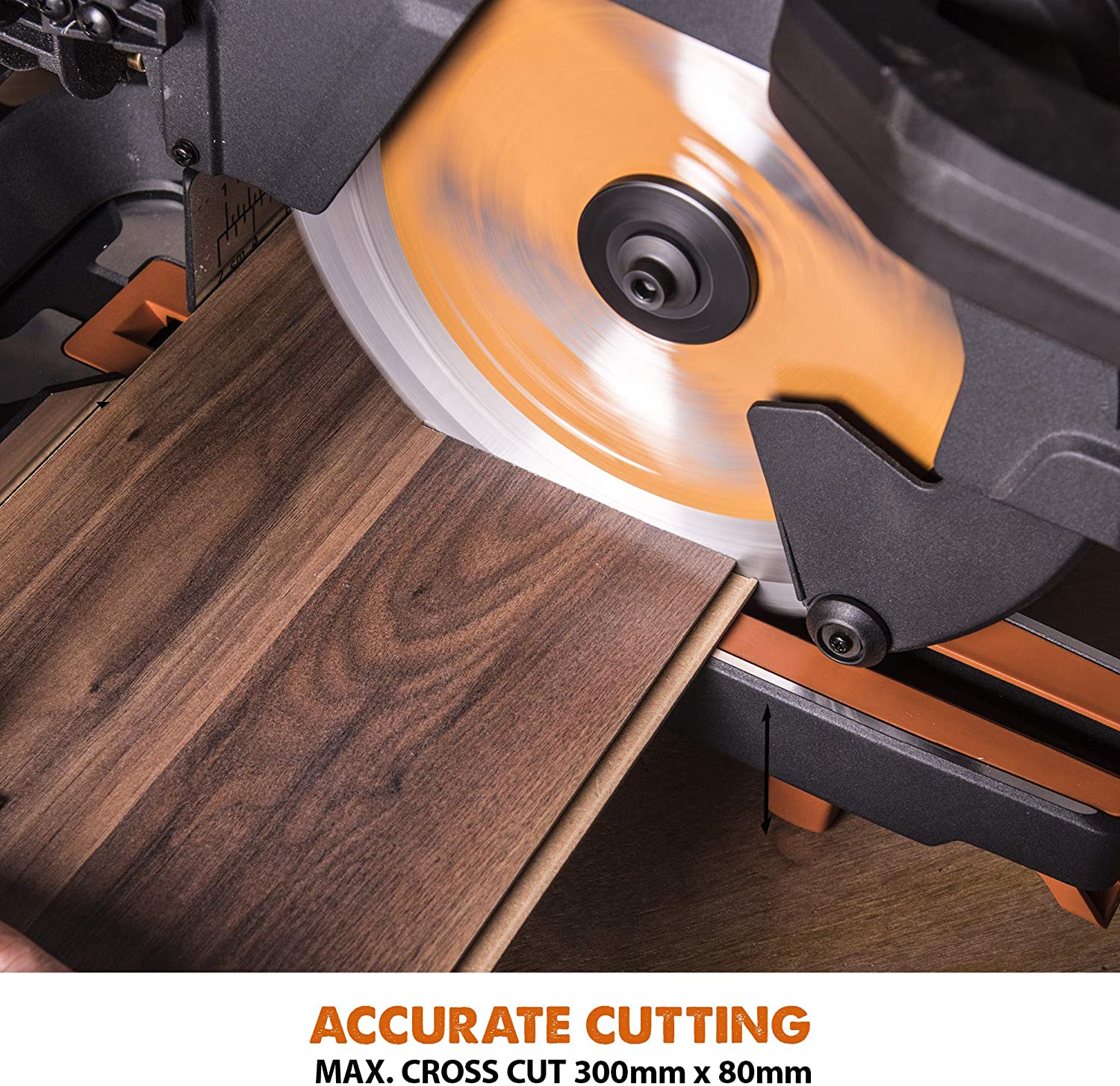 - Tačno sečenje sa kliznom funkcijom od 300 mm, podesivom dubinom reza i laserskim preciznim navođenjem.
