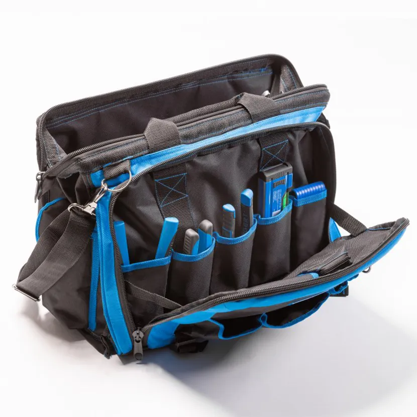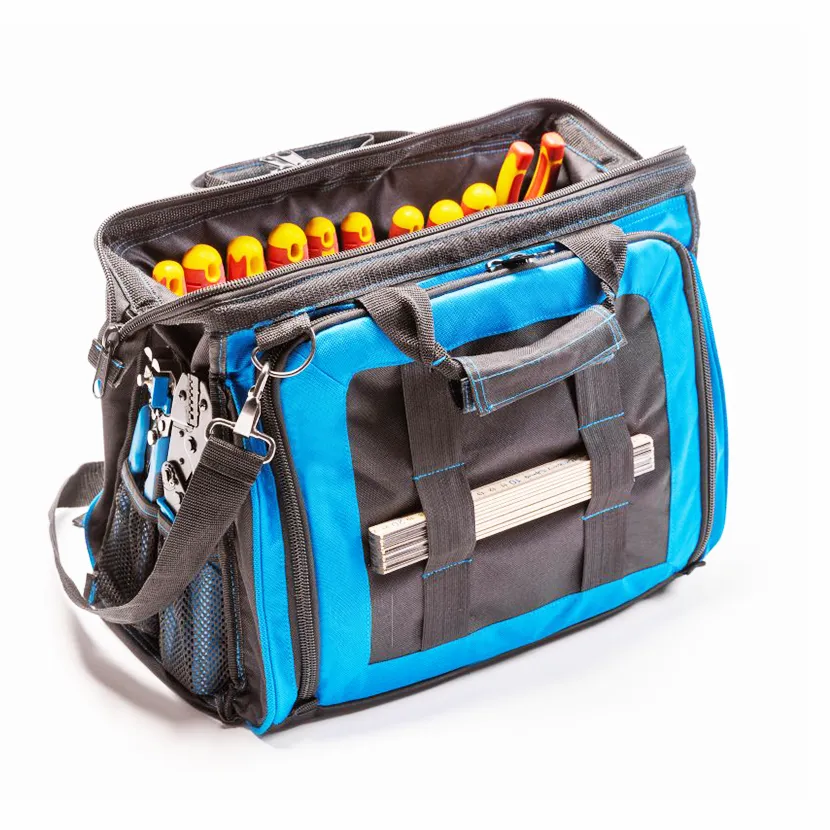 Električarska radna torba HT7G200 predstavlja savršeno rešenje za profesionalne električare koji vrednuju organizaciju, pristupačnost i zaštitu svojih alata. Napravljena od kvalitetnog 600D poliestera, ova torba nije samo izdržljiva, već i otporna na habanje, pružajući dugotrajnu upotrebu u različitim uslovima. Svojim kompaktnim i ergonomskim dizajnom, torba omogućava lako nošenje čak i kada je potpuno napunjena alatima.