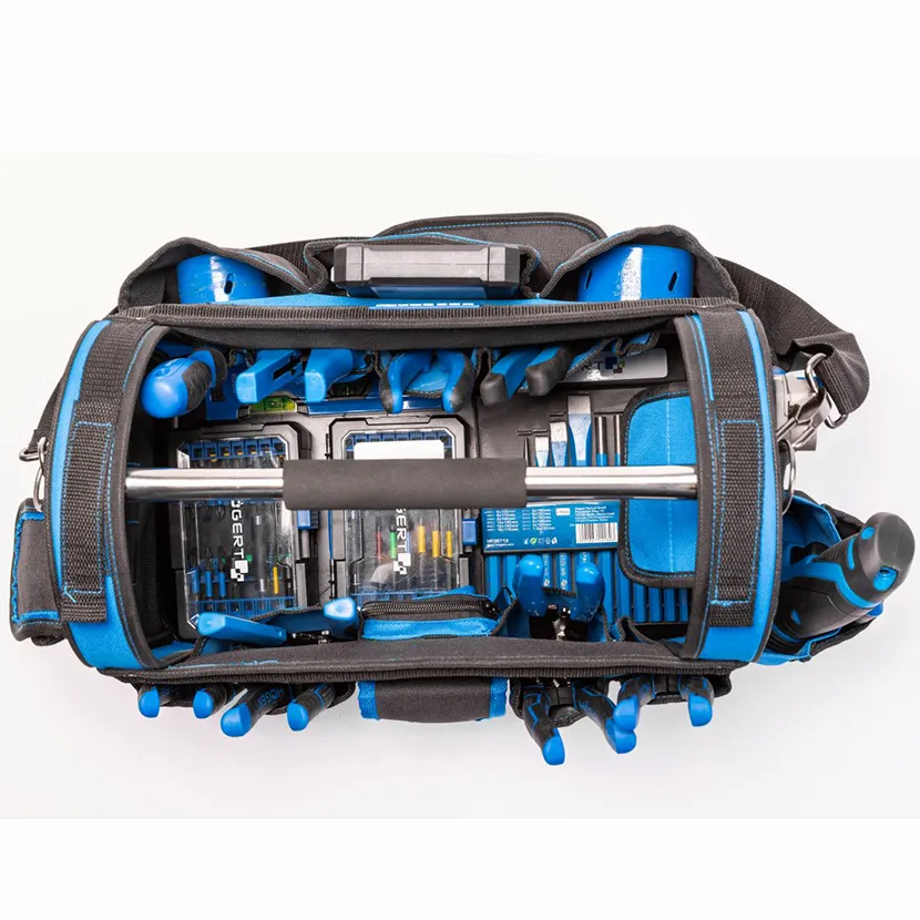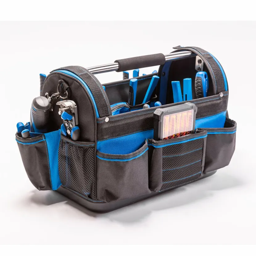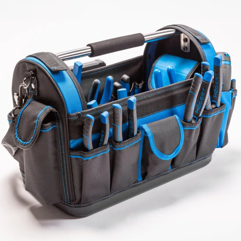 Radna torba I HT7G205 je savršen izbor za svakog profesionalca koji traži kombinaciju izdržljivosti i funkcionalnosti. Izrađena od najkvalitetnijeg 600D poliestera, ova torba za alat garantuje dugotrajnost i otpornost na različite vrste oštećenja. Istovremeno, zahvaljujući laganom materijalu, lako je prenosiva i jednostavna za nošenje. Odsustvo gornjeg poklopca omogućava brz pristup alatima, što je idealno za one koji žele da sve što im je potrebno bude nadohvat ruke.