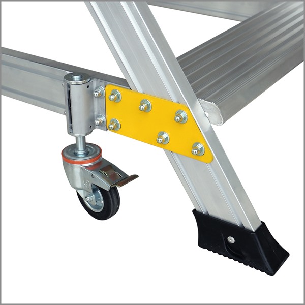 Blokiranje točkova se izvršava već pri prvom koraku odnosno pri svakom stajanju na stepenik platforme zahvaljujući opružnom sistemu koji obavlja postupak fiksiranja platforme. Ovaj sistem za blokiranje točkova čini industrijsku jednostarnu radnu platformu potpuno bezbednom i sigurnom jer ona ostaje zakočena sve vreme dok traje njeno korišćenje.