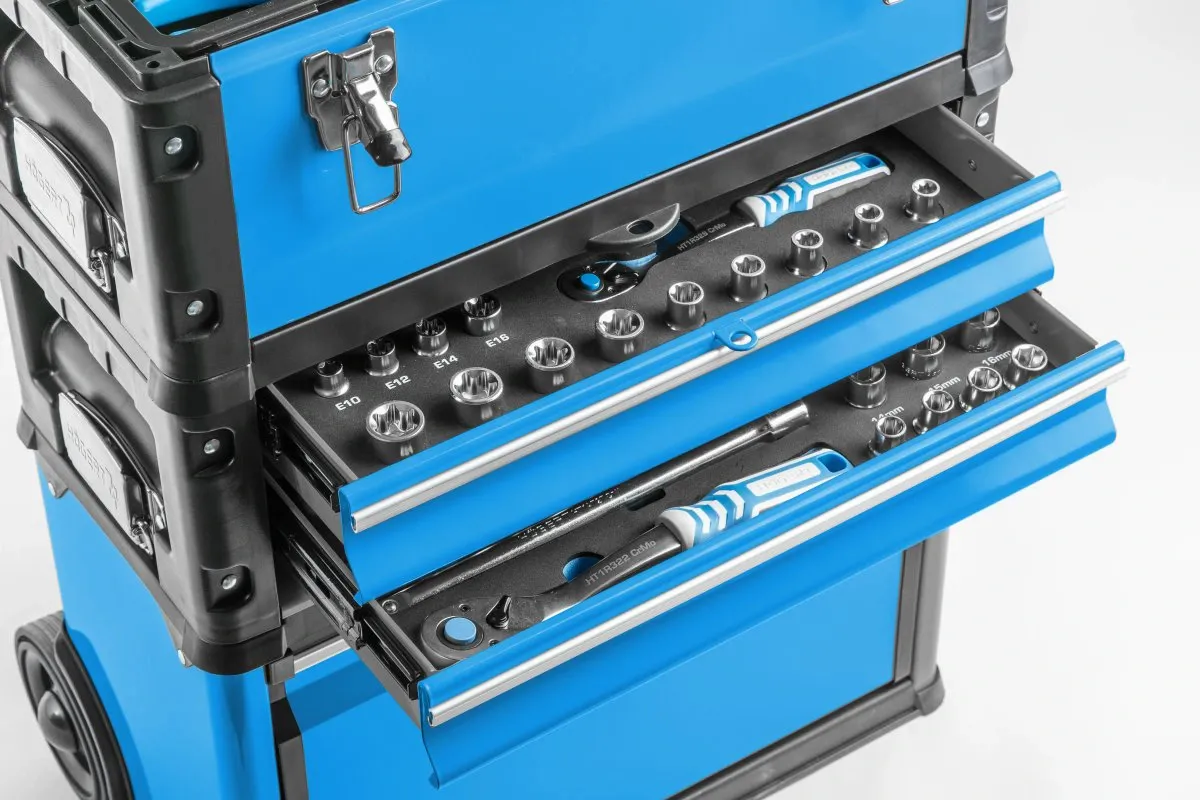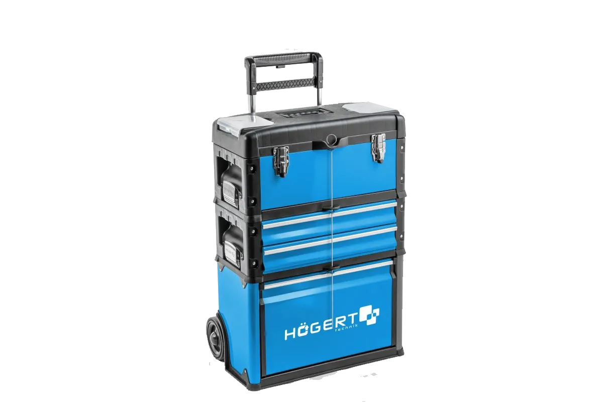 FIOKAR ZA RADIONICU SEGMENTNI NA TOČKOVIMA trodelni, modularni, mobilni servisni ormar. Tri nezavisna modula sa kutijom, fiokama i velikim prostorom za odlaganje omogućavaju organizovano skladištenje do 45 kg alata. Kompaktnih dimenzija, fiksni točkići i teleskopska sklopiva ručka omogućavaju da se vozilom prevozi i isporučuje gotovo direktno na radno mesto. Idealno za servisne kompanije, autoservise, kao i za garažu bilo kog kućnog entuzijasta. Idealno rešenje za profesionalce koji cene mobilnost, sigurnost i fleksibilnost.