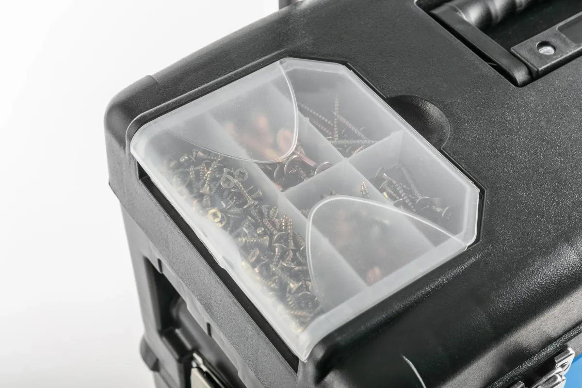 - U gornjem poklopcu nalaze se 2 organizatora za izvlačenje sa providnim poklopcem, svaki sa po 5 odeljenja za odlaganje sitnih delova i pribora i ležištem za alat.