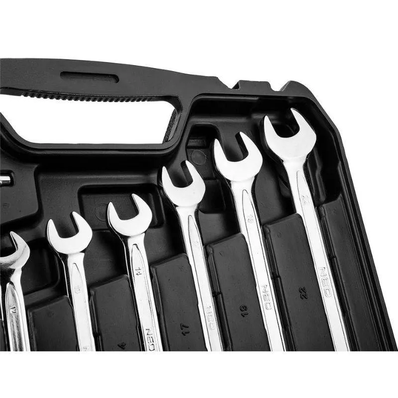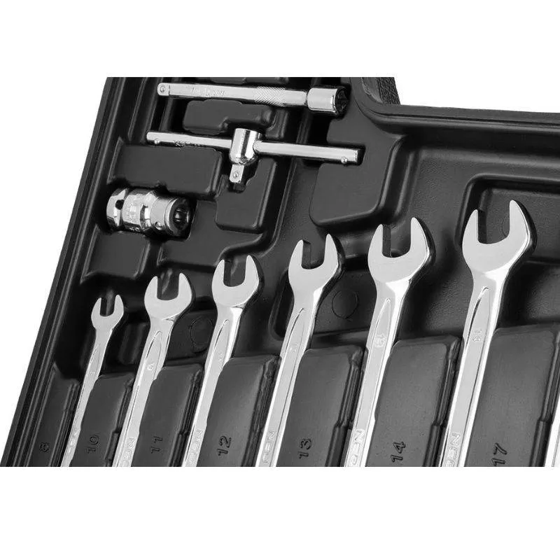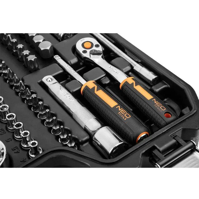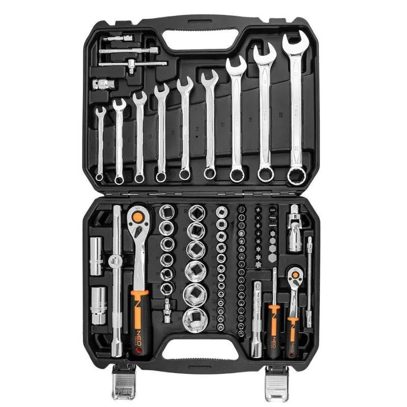 Set nasadnih ključeva 1/2″ 1/4″ 82 kom NEO (10-058) sadrži 82 komada alata i pribora koji se koriste za zavrtanje i odvijanje vijaka, u radionici, servisu i sl. Alati se nude u praktičnoj plastičnoj kutiji s metalnim zasunima s praktičnom ručkom. Osim toga, unutarnja strana pakiranja obložena je posebnim umetkom koji omogućuje održavanje reda i zaštitu sadržaja od oštećenja. Alati su izrađeni od visokokvalitetnog krom-vanadij čelika. Račne su opremljene i ručkom od dva materijala, koja pripada novom dizajnu ručke, još udobnija za korištenje.