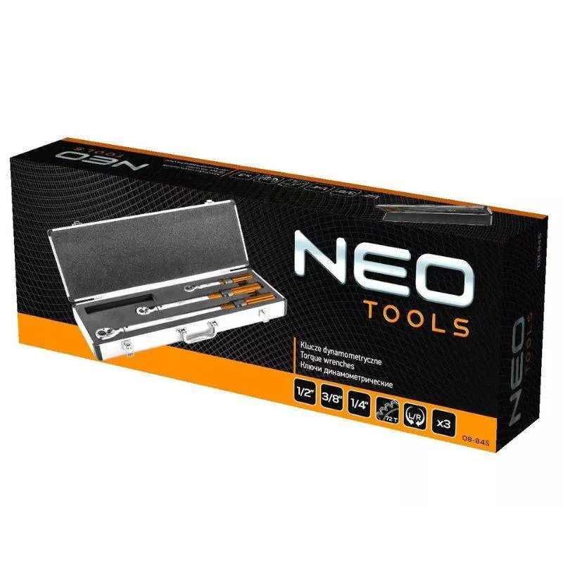 Set dvosmjernih moment ključeva 1/4″, 3/8″, 1/2″ NEO 08-845 uključuje tri ključa sa sledećim radnim opsegom: