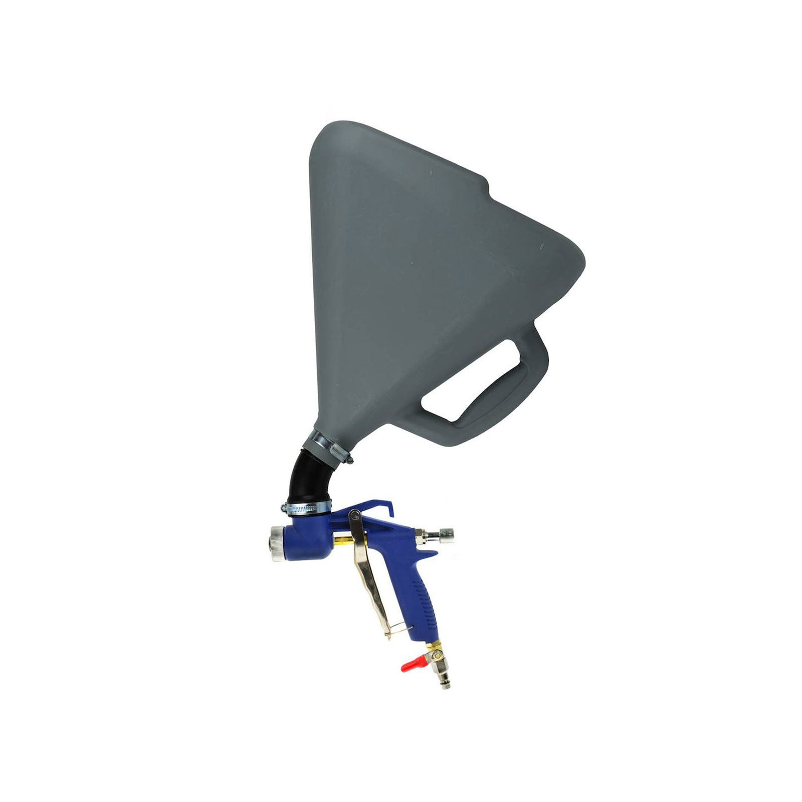 Rezervoar pištolja opremljen je plastičnim kolenom i delimično zatvoren, što omogućava farbanje plafona