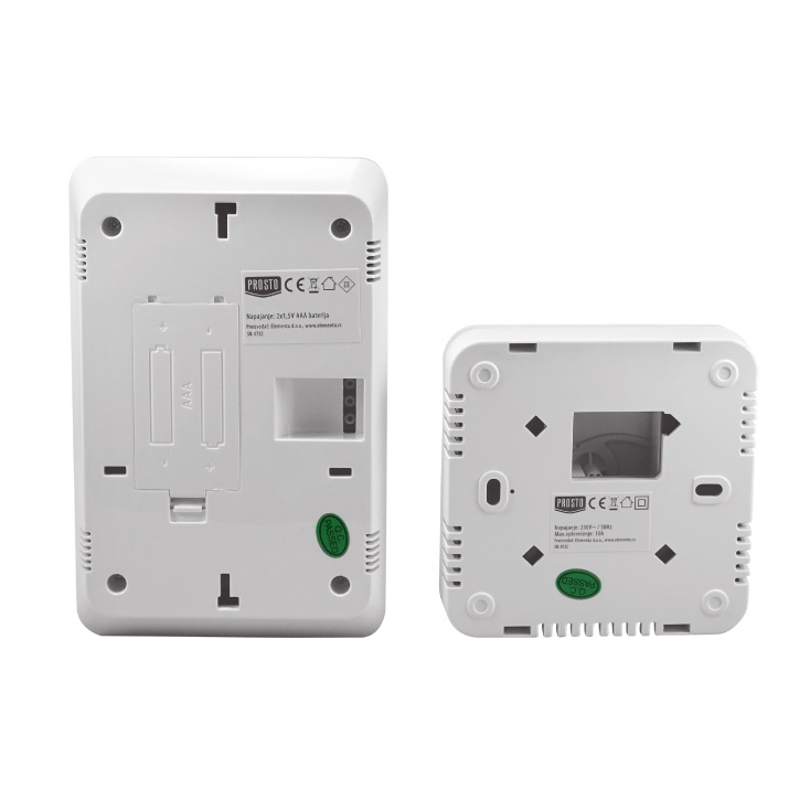 Dimenzije 135x87.5x23.2 mm (termostat, bez stalka), 86x86x26 mm (prijemna jedinica)