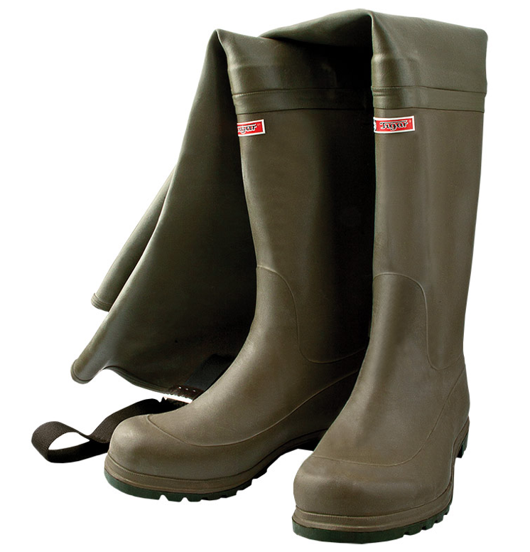 DetaljnijeDuboke ribarske čizme proizvedene od gume sa tekstilnom postavom, zelene boje. Čizme sa spoljašnje strane pri vrhu imaju kaiš sa metalnom kopčom, protivklizni đon ima apsorber energije u oblasti pete. Veličina 39-47 EN ISO 20347