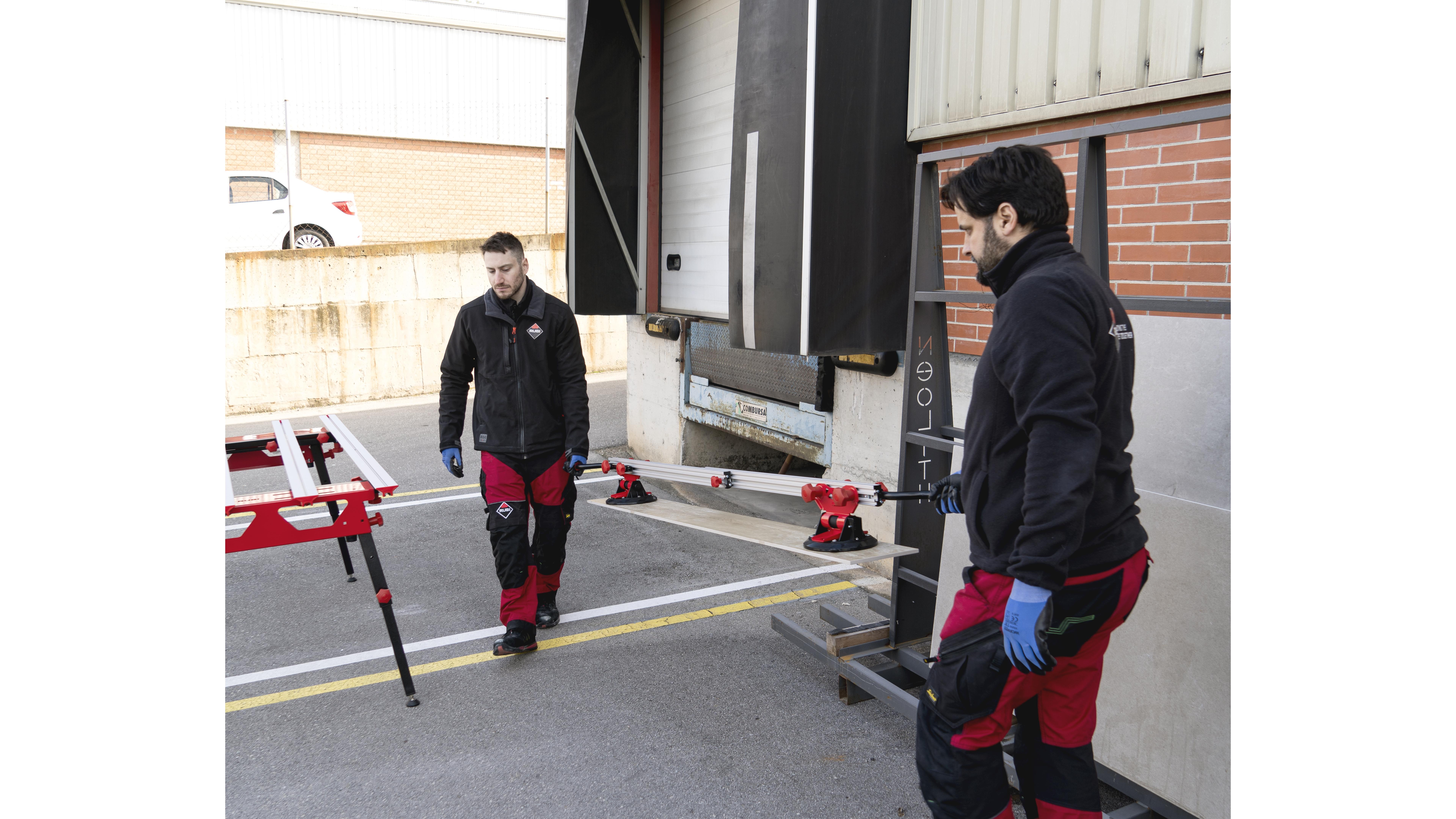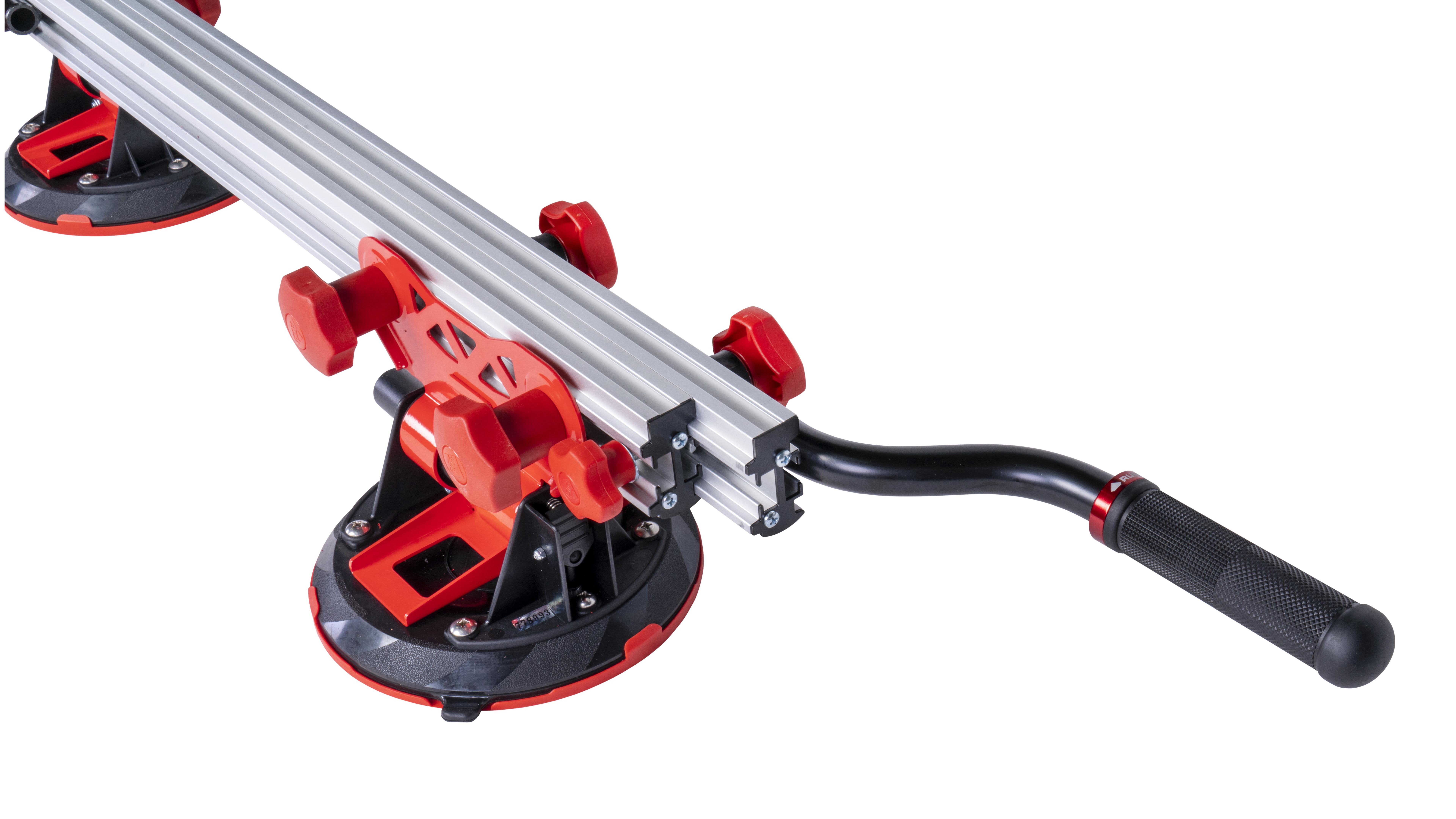 - Podesiv aluminijumski vodič. Omogućava rukovanje i transport pločica veličine između 100 cm (39 3/8") i 210 cm (83"). Posebno preporučuje se za formate do 150x150 cm (60x60"), debljine 6 mm ili 8 mm, koji se koriste pod uglom.