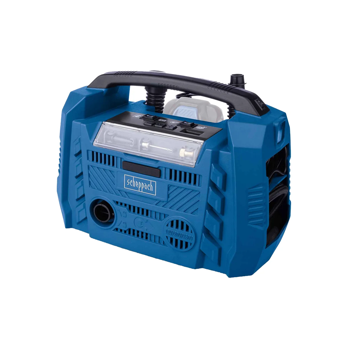 Scheppach hibridni kompresor Airforce 6 ima tri izvora napajanja – njime se može upravljati preko kabla za napajanje (230 V) , moćne IXES baterije od 20 volti ili priključka od 12 volti (automobilski priključak). Maksimalni radni pritisak od 10.3 bara se lako podešava pomoću providne kontrolne table.