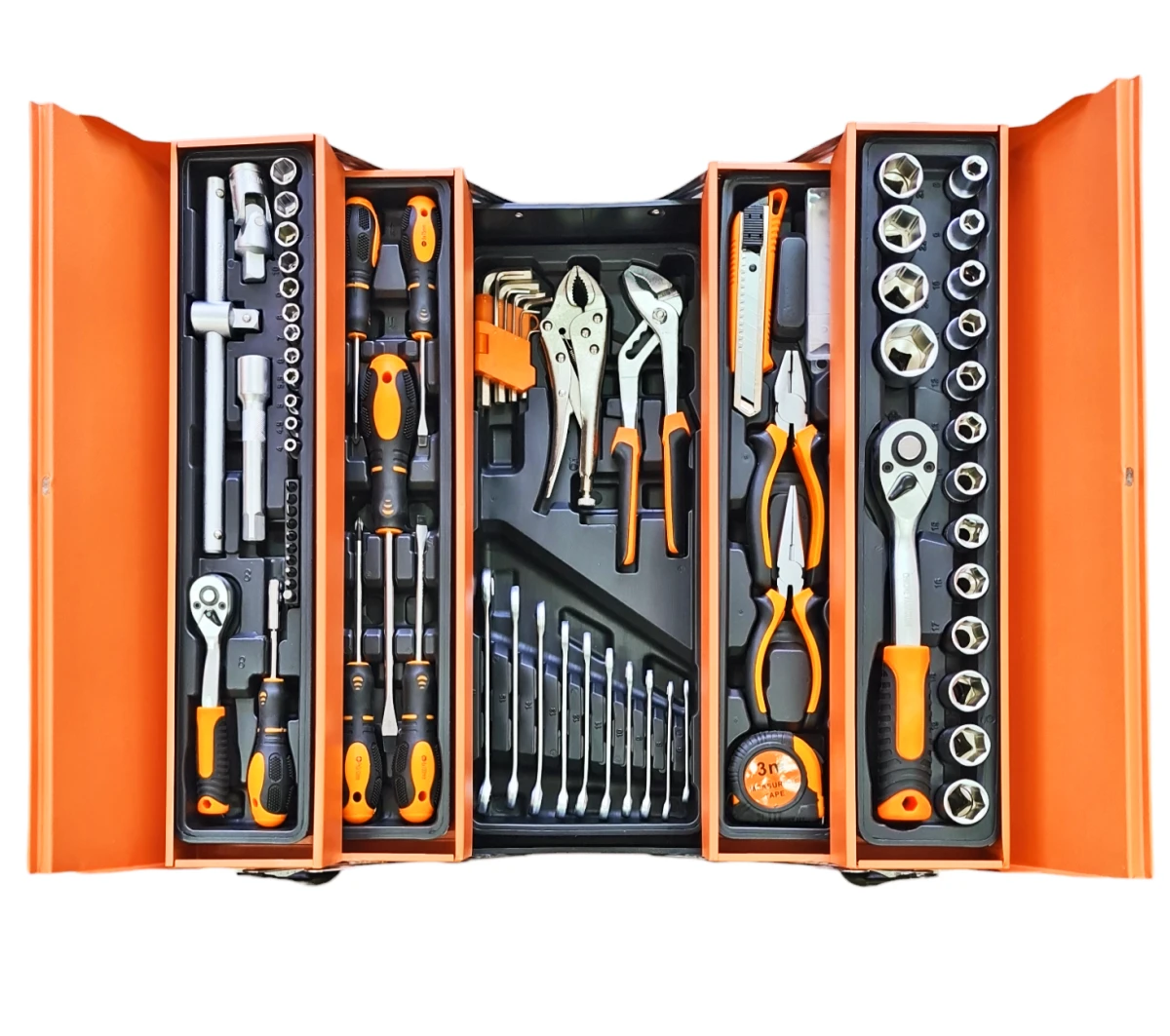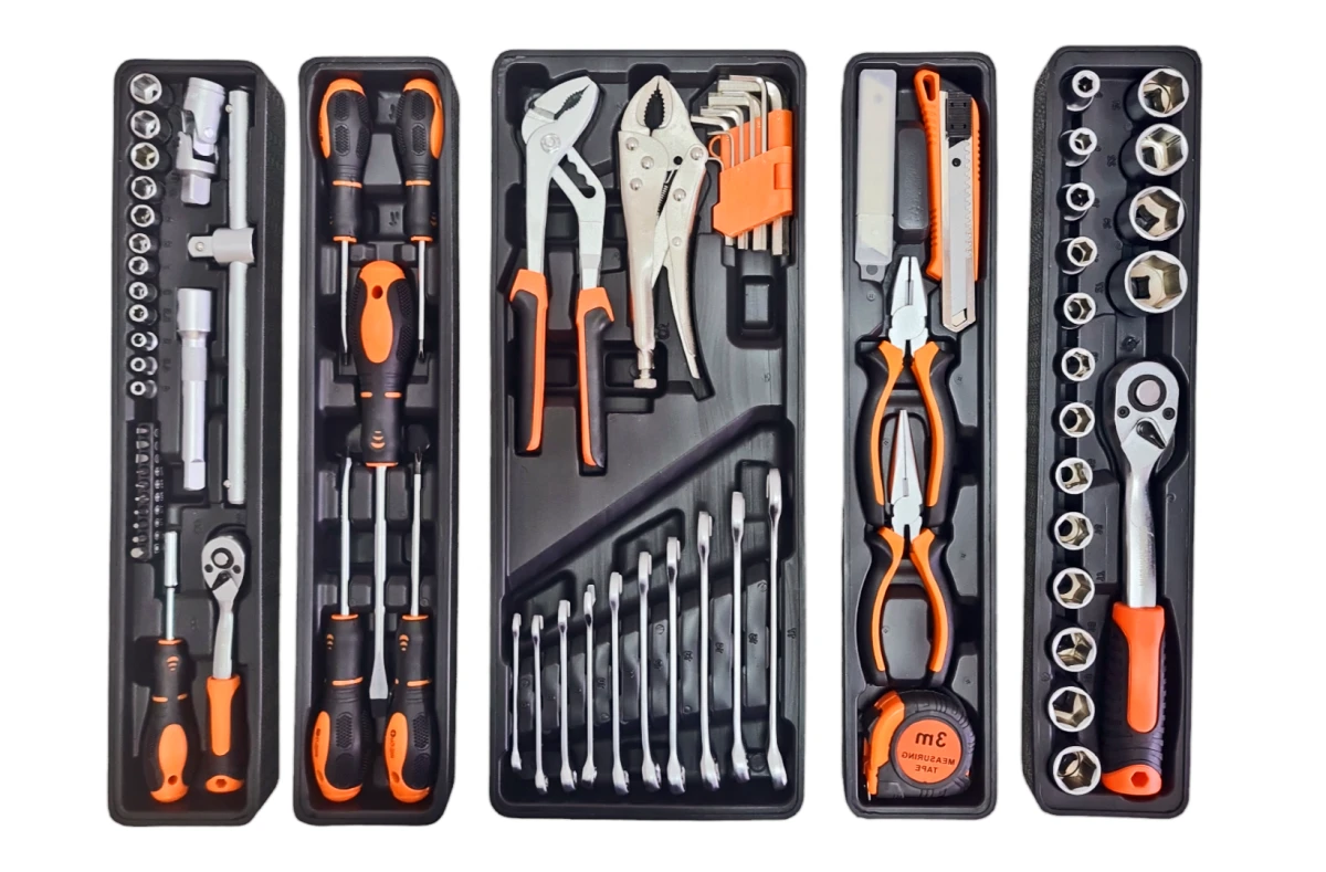 Set sadrži gedore, ključeve, inbuse ,klešta, štafciger.