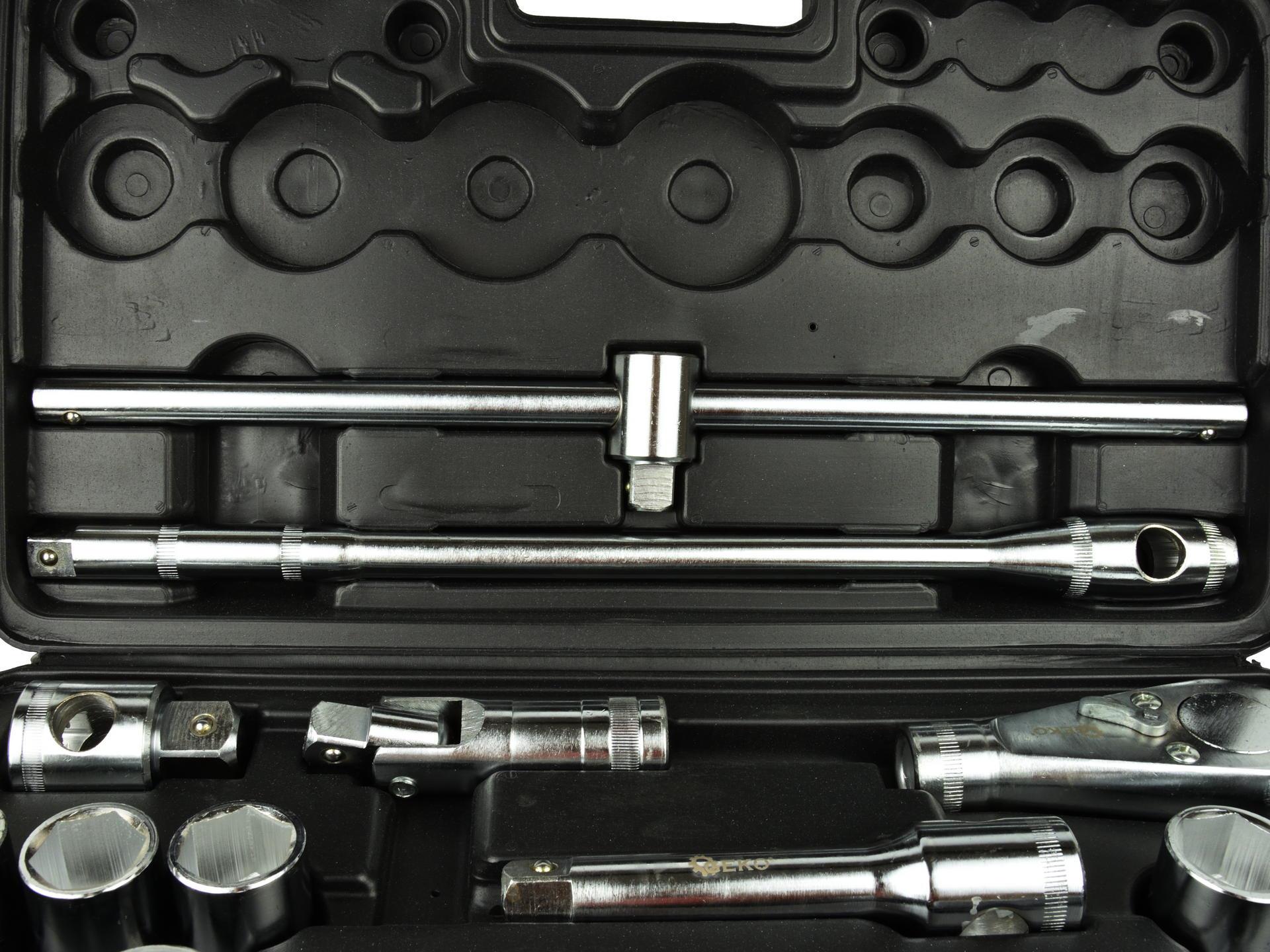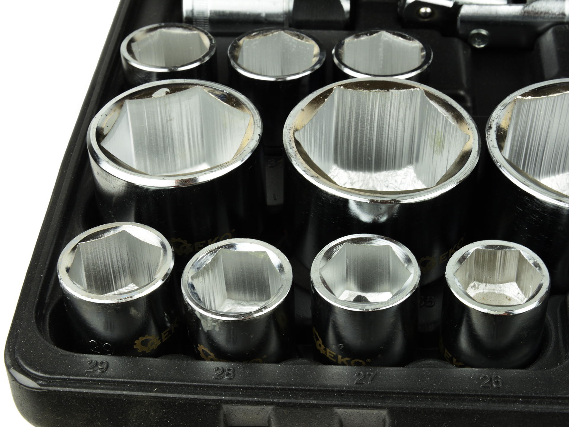 GEKO set nasadnih ključeva koji se sastoji od 26 elemenata. Set uključuje set šestougaonih utičnica sa utičnicom 3/4 “i 1″, T-dugmu (3/4″), čegrtaljku (3/4″), set nastavaka (3/4″) i otvor od 1 inča. Svi elementi seta su izrađeni od visokokvalitetnog CrV hrom-vanadijum čelika. Cela stvar je smeštena u zgodnu kutiju od izdržljive plastike.