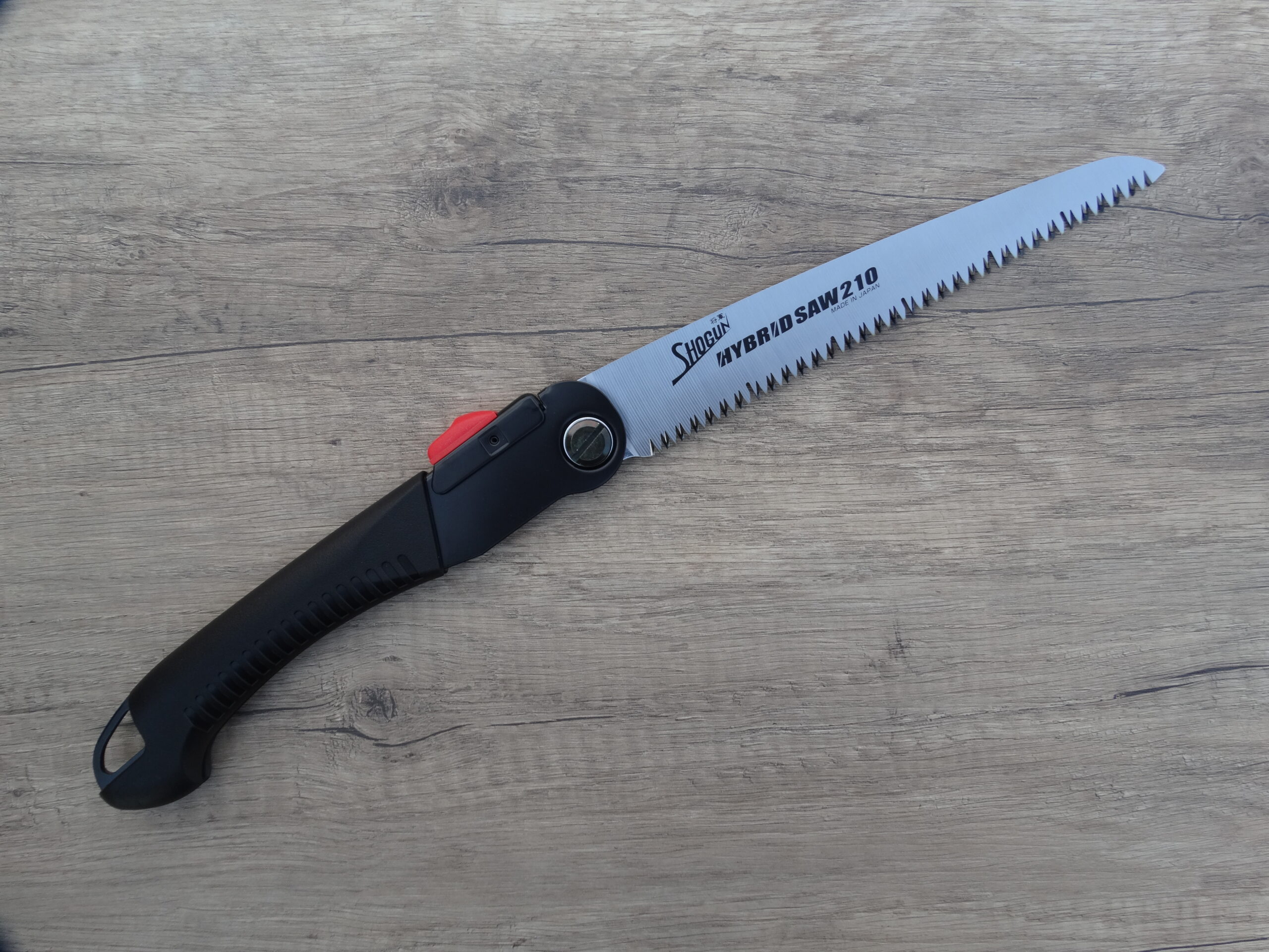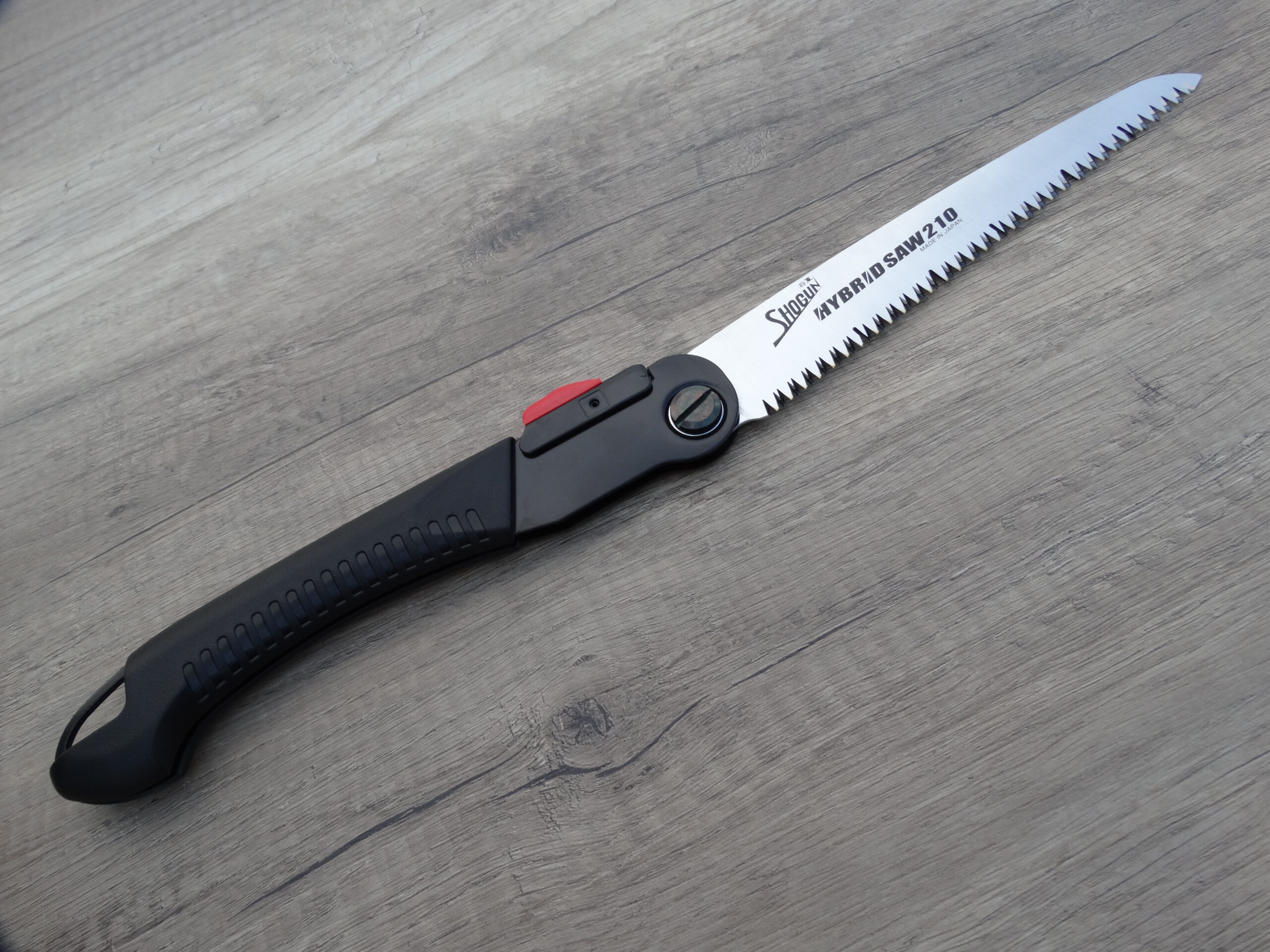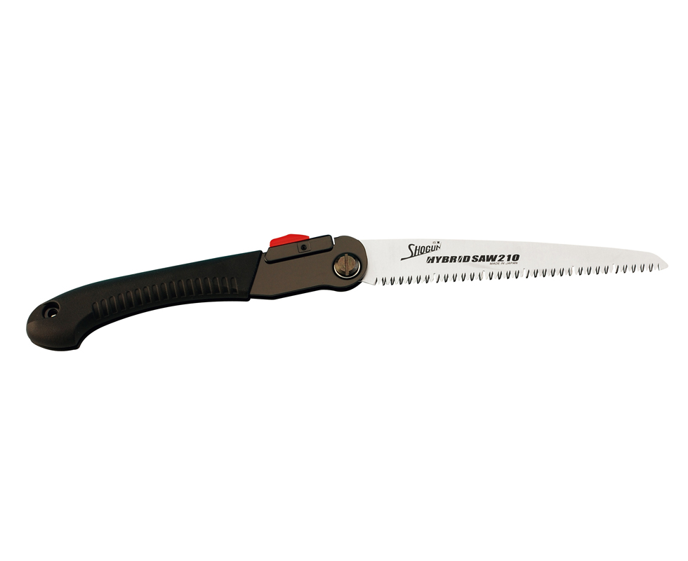 Shogun japanska ručna testera HB-210 je hibridna višenamenska testera za sečenje svežeg zelenog drveta, grana, bambusa, suvog i ogrevnog drveta, itd. Sklopiva je, što je čini kompaktnom i pogodnom za nošenje. Sečivo se može podesiti u dva položaja (2-stepeno podešavanje ugla drške), zahvaljujući čemu je sečenje mnogo lakše na tlu ili na teško dostupnim mestima. Ono se otključava, odnosno otvara laganim pomeranjem sigurnosnog dugmeta za zaključavanje sečiva. Kada završite sa korišćenjem, jednostavno ga sklopite nazad u dršku.