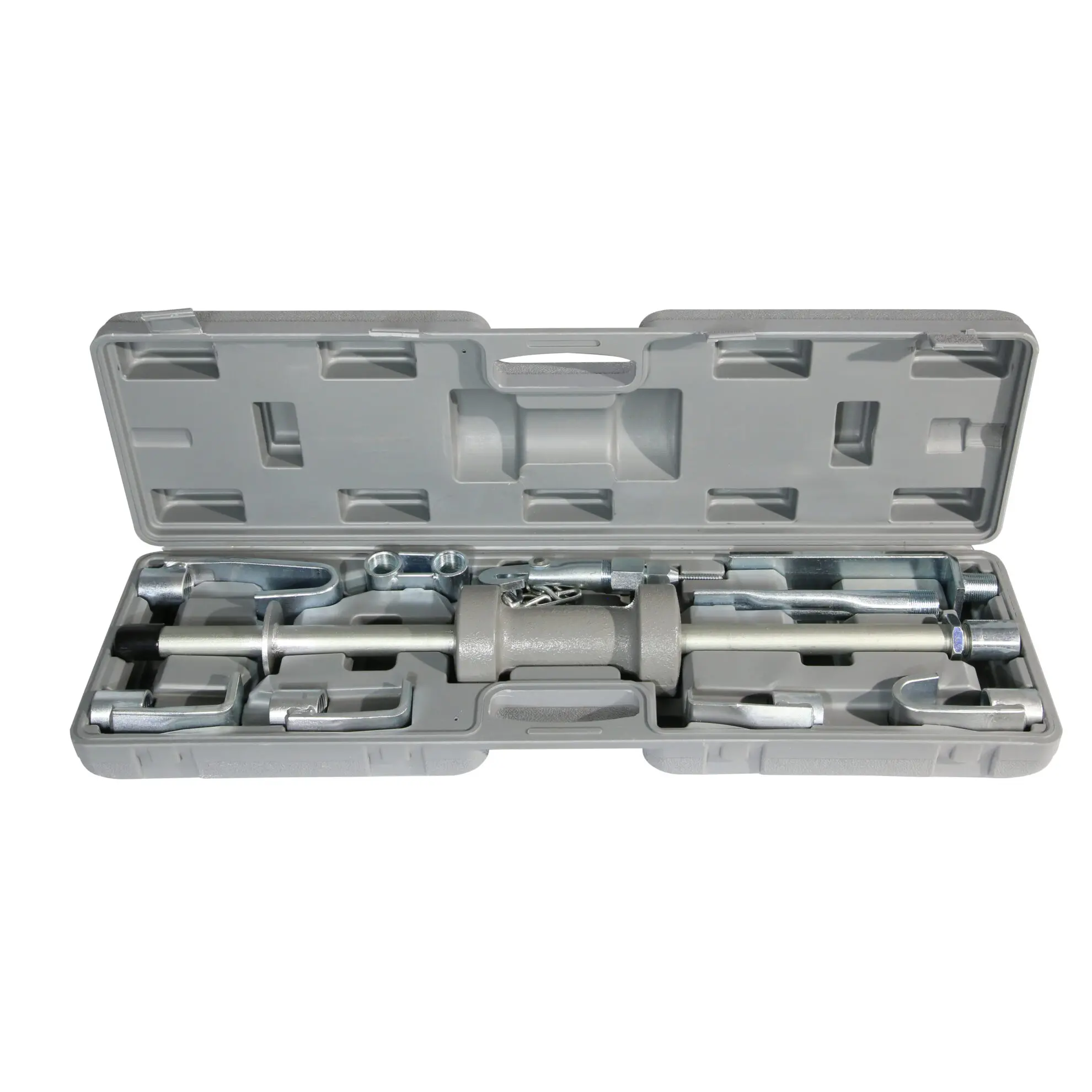 Ovaj komplet je idealan za auto‑limarske radove, izvlačenje zaglavljenih delova poput ležajeva i osovina, kao i za poravnavanje udubljenja na limu. Dolazi u čvrstom koferu koji štiti alat i olakšava transport.