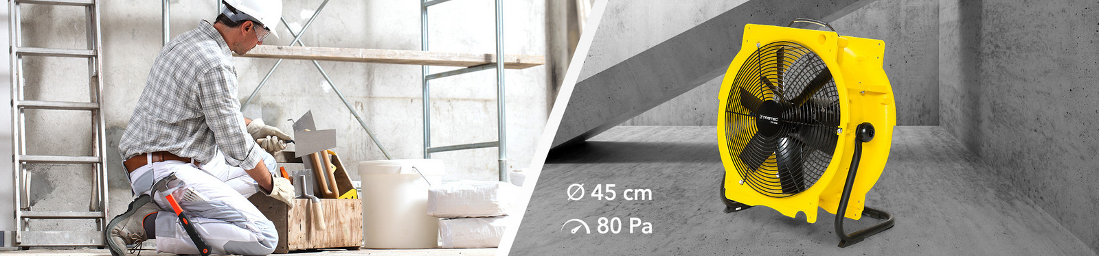 Aksijalni ventilator visokih performansi TROTEC TTV 4500 proizveden je u skladu sa visokim industrijskim standardima. Predviđen je za profesionalan kontinuiran rad čak i u najtežim uslovima. Otporan je na prskanje (IP55). Ima mogućnost slaganja koja štedi prostor za transport i skladištenje. Dostupan je odgovarajući adapter za crevo. Opcioni adapter za povezivanje služi za povezivanje vazdušnog transportnog creva ili vreće za prašinu na TTV 4500 npr. za izvlačenje čestica prljavštine usisavanjem.